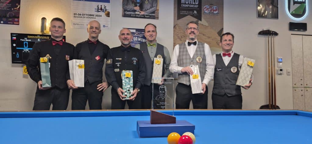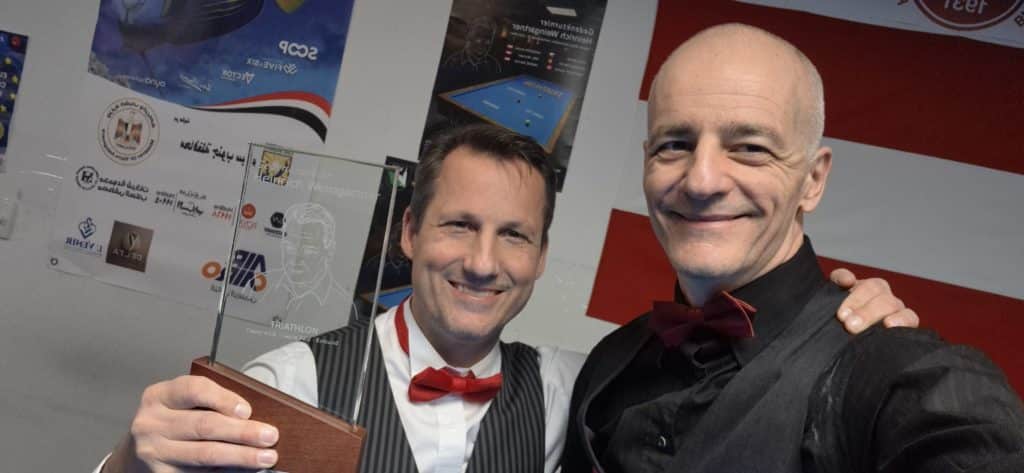 Arnim Kahofer le king local 4 fois champion d’Europe, Patrick Niessen le belge vétéran 11 fois champion d’Europe, Marek Faus le tchèque double champion d’Europe, Michael Hikl et Patrick Andre, autrichiens et également champions d’Europe, et moi-même dans un mode malheureusement délaissé par nos instances dirigeantes : le triathlon ! Chacun contre chacun, au 47/2, au 71/2 et à la bande, sur des distances courtes de respectivement 150, 125 et 75. Bref pour nous amateurs de jeux de série, ce type de tournoi c’est de la tuerie ! Et que du bonheur bien sûr ! Avec des parties qui durent environ 4 heures, c’est donc 8 heures de jeu tous les jours ! Honnêtement, tous pouvaient prétendre à la victoire et bien malin celui qui aurait pu annoncer à l’avance le classement final. Je vous laisse regarder les résultats sur la page dédiée sur le site du WBA. Un très grand bravo à Arnim Kahofer pour sa victoire à la maison, à Marek Faus pour se seconde place qui a été impressionnant également, à Patrick Niessen qui parfois déroulait du jeu de cadre et de ligne à la totale perfection… Voilà le podium ! Un grand bravo aussi à Michael Hikl et Patrick Andre qui rêvaient certainement d’un meilleur classement, mais quel plaisir pour moi de les revoir à un niveau international qui vont certainement leur permettre de remonter sur un podium européen.