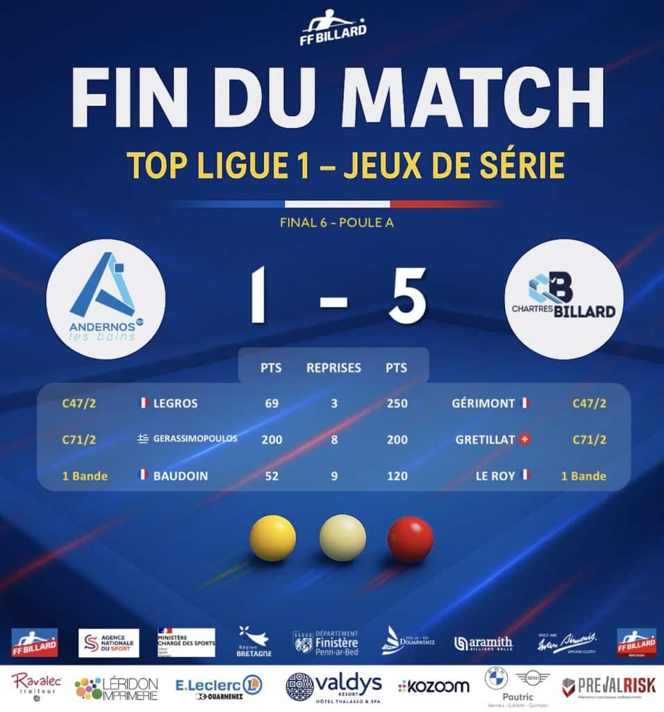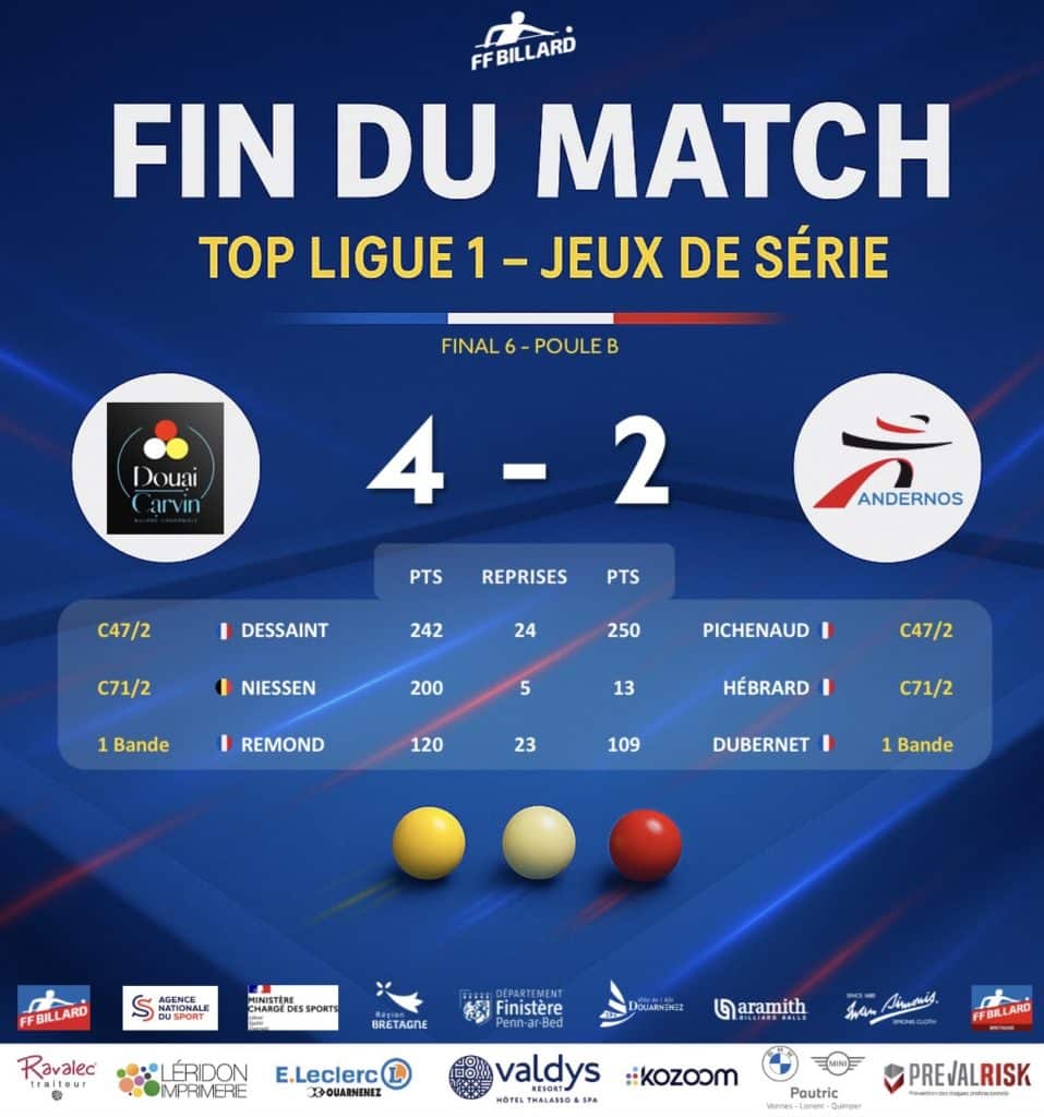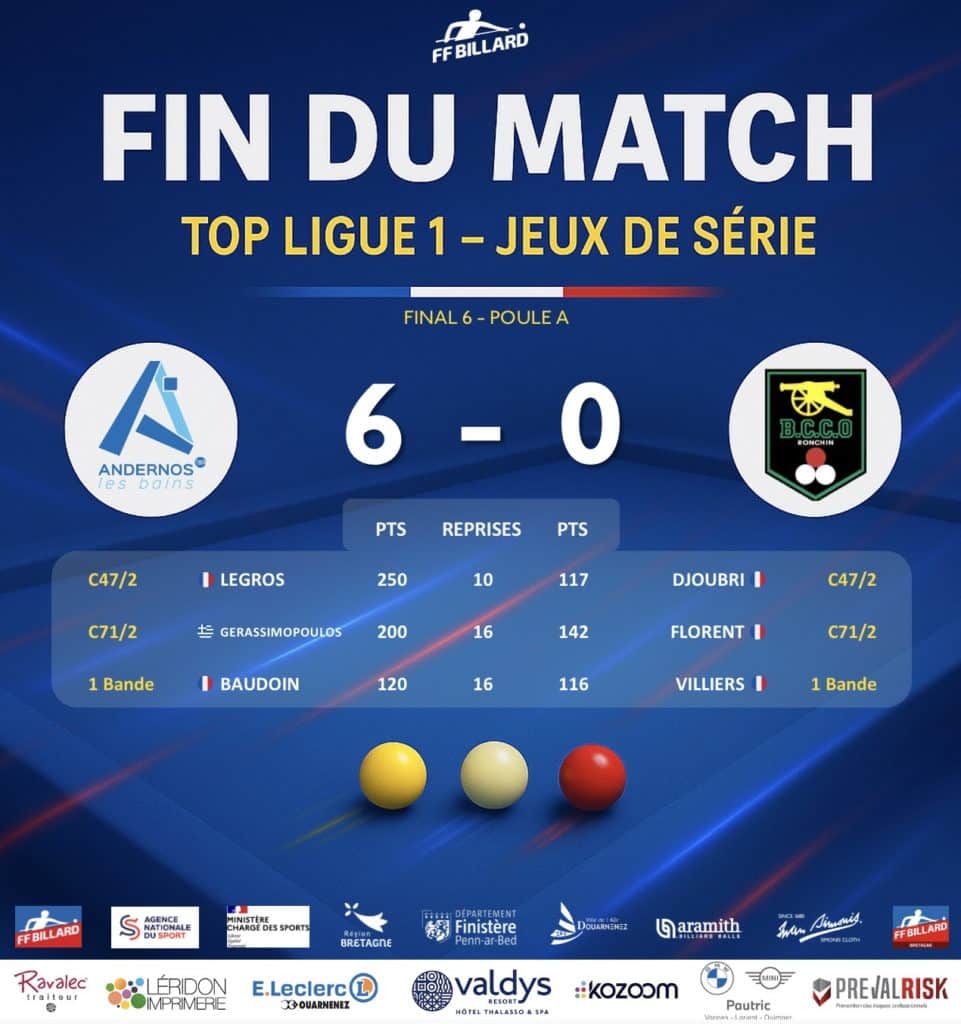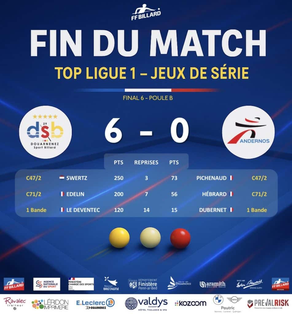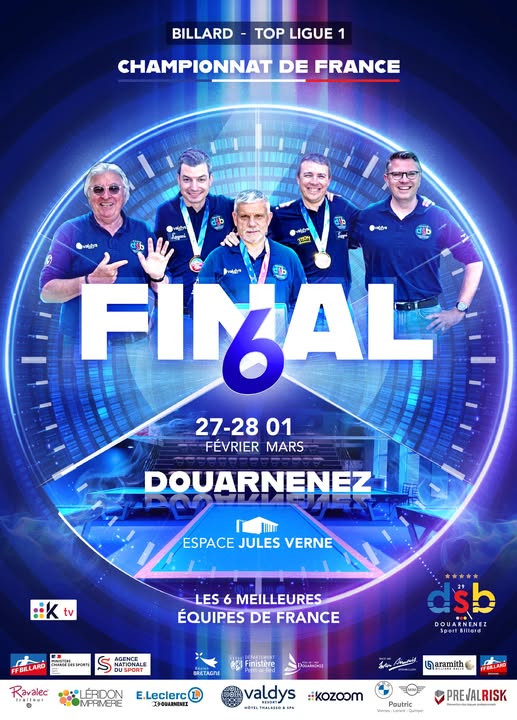 Ce week-end du 27-28 février et du 1er mars 2026, c’est à nouveau le septuple champion de France qui a organisé la finale du championnat de France des Jeux de Série, le Final6 Top Ligue. Lors de cet événement, ce sont les 6 meilleures équipes du championnat qui s’affrontent pour le titre dans un Final6. Dans le groupe A, les équipes du C’Chartres (Gérimont au 47/2, Gretillat au 71/2, Leroy à la bande), de Ronchin (Djoubri, Florent, Villiers) et Andernos (Legros, Gerassimopoulos, Baudoin), alors que dans le groupe B on retrouvait le DSB Douarnenez Valdys, champion de France, (Swertz, Edelin, Ledeventec), l’Entente Douai Carvin, championne d’Europe, (Dessaint, Niessen, Remond) et Andernos Intermarché (Pichenaud, Hebrard, Dubernet).