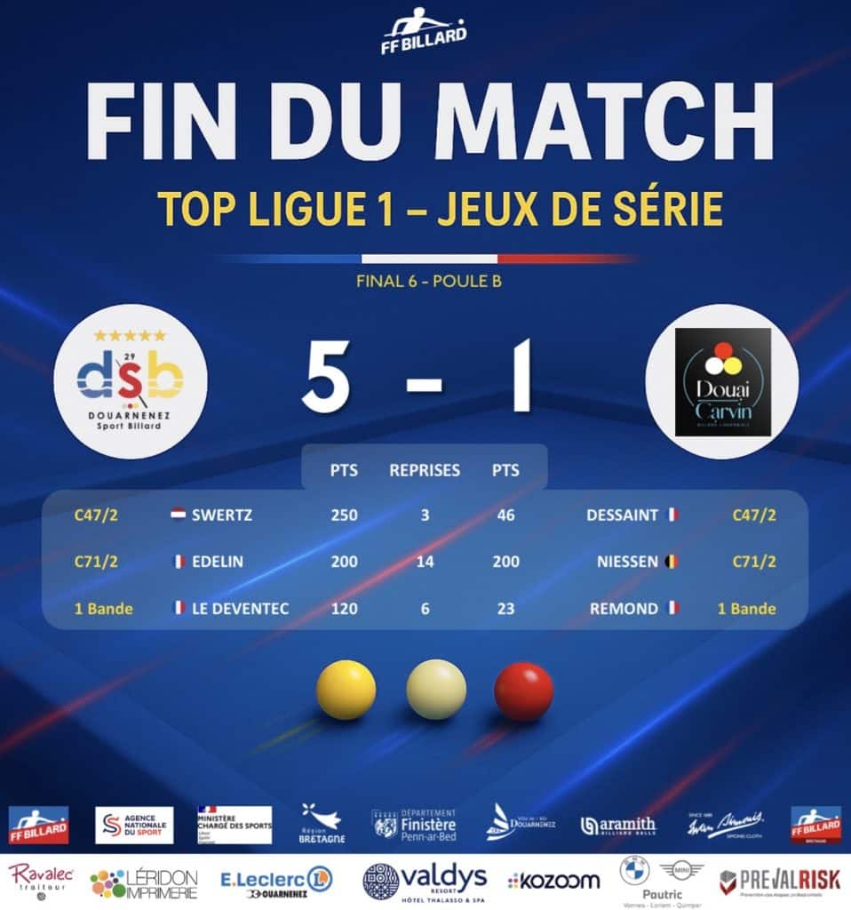 En finale, le DSB Douarnenez obtient un premier point rapidement avec la victoire en une seule reprise de Swertz au 47/2. Puis Remond de Douai Carvin remet les pendules à l’heure en battant Ledeventec. Tout se joue donc au cadre 71/2 entre Niessen et Edelin, ce dernier finit ses 200 points en premier, mais Niessen égalise sur la reprise. Egalité, prolongations sur les trois tables avec 10% des distances pour chacun. Swertz finit ses 25 points très rapidement, et Dessaint tente l’égalisation. Mais sur l’autre table Edelin ne fait que 5 et Niessen apporte une première victoire au 6ème point. La 2ème victoire victoire vient de Remond qui dépasse les 3 points marqués par Ledeventec. Douai Carvin exulte, ils sont champions de France !