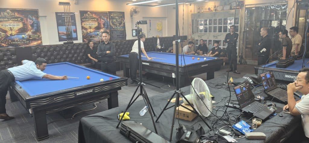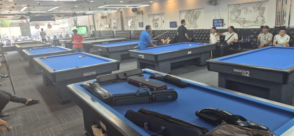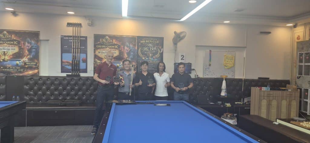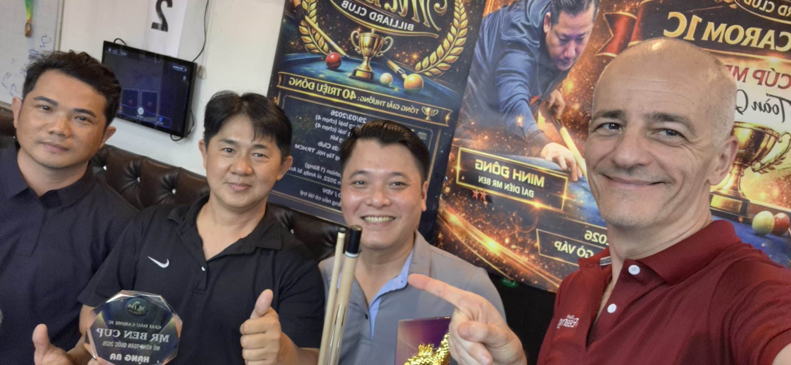 Me revoilà aux prises avec les tueurs vietnamiens qui apprennent décidément très rapidement et qui démontre un niveau de jeu toujours plus fort d’année en année. Je vous passe les détails des conditions de jeu « Vietnamese style » que j’ai déjà évoqué plein de fois et que je peux résumer ici en « surréaliste ». La formule est simple, un tableau de 64 joueurs en élimination direct, tirage au sort dès le départ. Résultat des courses, j’élimine d’abord le local de l’étape Minh Dong, un des plus fort joueur de ce pays, en 6 reprises pour 80 points. Le 1/16éme de finale se déroule en 5 reprises. Le 1/8ème de finale en 100 points dès ce stade en 7 reprises contre Hoang Viet qui cette fois n’a rien trouvé à redire à mon jeu… J’ai survécu à cette première journée ! Le lendemain, je joue le 1/4 de finale, toujours en 100 points en 3 reprises, puis la demi-finale en 6 reprises, avant de subir la loi du vainqueur, Mr. Phuoc Thanh, auteur d’une belle finale en 7 reprises avec une jolie série de coin tout en style « Gretillat »… Bravo à lui ! Les trois premières places sont squattées par le même style… il ne va pas faire long avant que d’autres s’en inspirent et copient le style… Pour ma part un joli parcours, quasi 15 de moyenne générale sur 6 matchs courte distance, la meilleure moyenne et la meilleure série de 72 arrêtée, je peux en être content. Mais aussi une leçon à tirer qui m’a coûté chère dans la finale, puisque j’ai subi les conditions d’attente et la fatigue qui m’ont coûté l’énergie nécessaire à la lutte ! Rendez-vous la semaine prochaine pour un second tournoi, dernière répétitions pour les vietnamiens avant leur championnat national à la bande et aux 3 bandes !